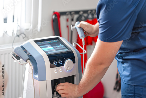 Physiotherapist doctor uses medical equipment for effective pain treatment.