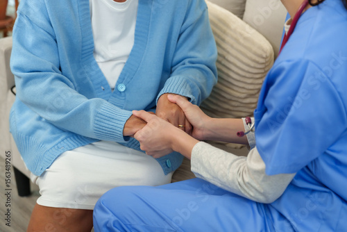 Physiotherapist gently holds elderly patient’s hands, offering emotional support and encouragement, creating a sense of comfort and building trust during recovery.