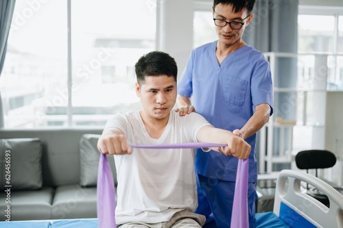 Physiotherapist Helping Patient While Stretching His Leg in bed