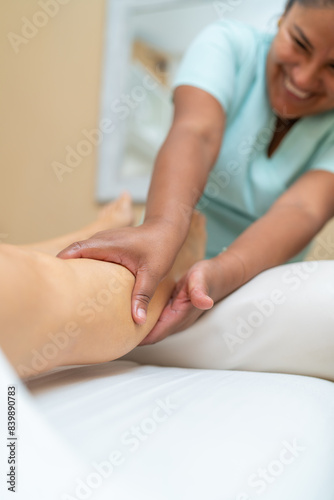 Physiotherapist pressuring while massaging the leg of a woman