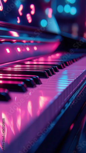 Piano keyboard close-up, glowing holographic notes floating above, sleek modern stage setup, neon lighting reflecting on keys, sharp focus on details