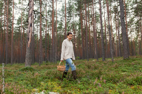 picking season and leisure people concept - young woman with mushrooms in wicker basket walking in forest