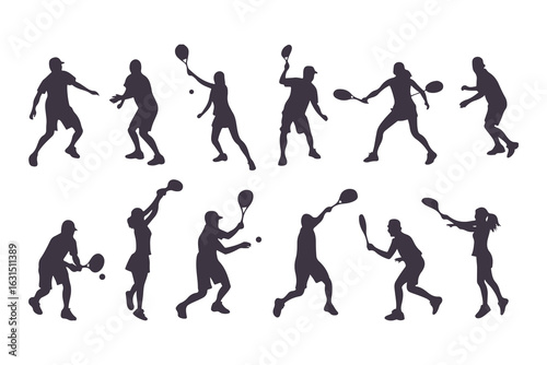 Pickleball player silhouette set. Collection of male and female athletes in various action poses like serving and hitting. Isolated vector sport figures for logos, tournaments, and design.