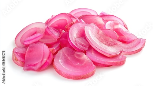 Pickled sushi ginger slices arranged on a white background showcasing vibrant pink color and unique texture perfect for culinary visuals