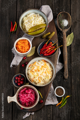Pickled vegetables on wooden background. Salting vegetables.