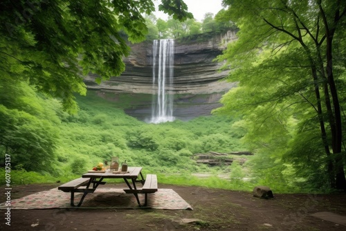 picnic with view of waterfall, surrounded by greenery, created with generative ai