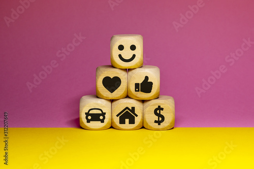 Pictogrammes de smiley heureux, santé, maison, voiture, et dollar sur cubes en bois