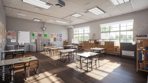 Picture a 3D classroom filled with desks, chairs, and educational posters on the walls.