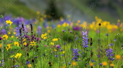 Picture a serene alpine meadow blanketed in colorful alpine flowers, their tiny blooms dotting the landscape with hues of purple, yellow, and blue, creating a vibrant and picturesque scene.