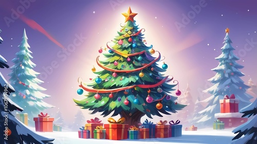 picture of a decorated Christmas tree in cartoon style on a white background