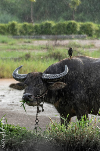Picture of a water buffalo with a bird on hims back at a rainy day looking to the camera