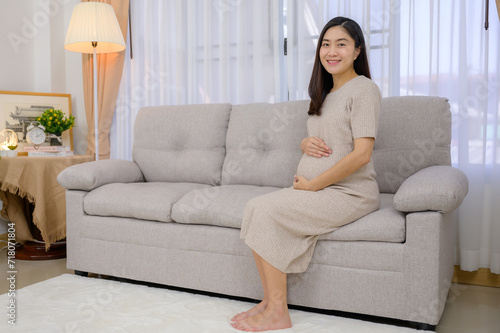 Picture of asian pregnant woman sitting on sofa in living room at home Carrying a large belly She smiles looking at the camera and is happy at her home