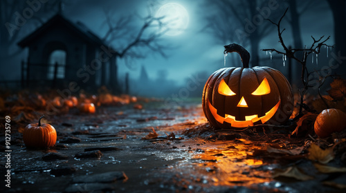 Picture of Halloween holiday. Orange pumpkins, bats and different scary decorations