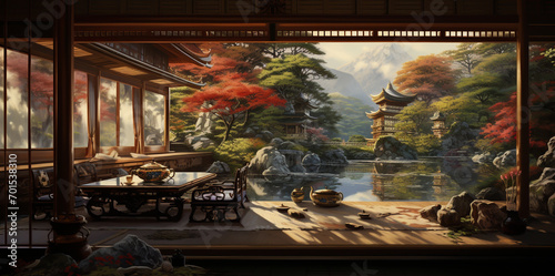 Pictures of a Japanese-style relaxation and guest room with paintings on the walls showing beautiful nature.