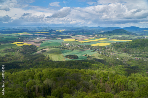 Picturesque aerial view on small czech village and green forest as foreground with clouds and blue sky