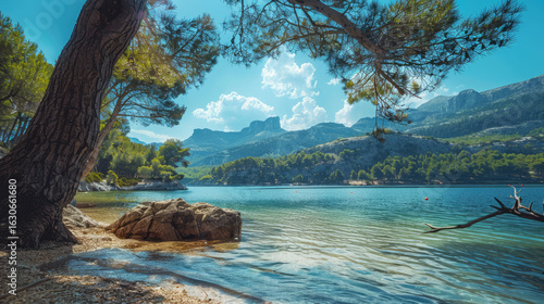 Picturesque lake scene framed by trees, capturing the serenity of a secluded cove against a mountainous backdrop.