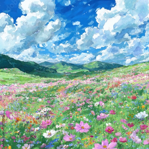 Picturesque Landscape Painting of Rolling Hills, Lush Greenery, and Vibrant Wildflowers under Soft Blue Sky with Fluffy White Clouds, Featuring an Anime-Style Face as the Focus