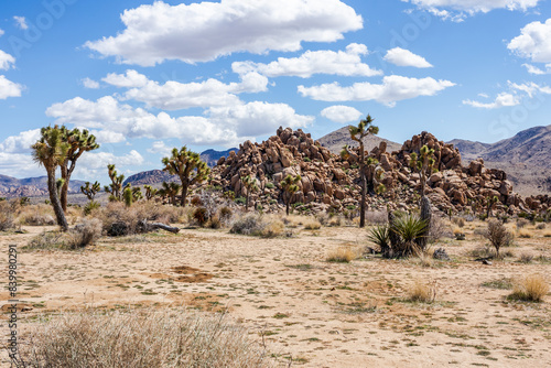 Picturesque landscape with Joshua Trees and accumulation of rock formations in the Joshua Tree National Park in Southern California