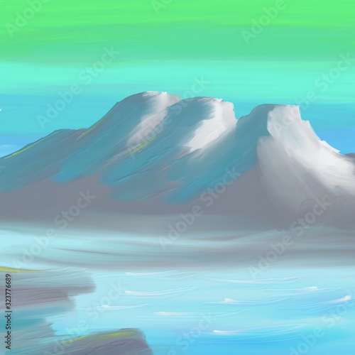 picturesque mountain landscape by the lake green day sky painted with acrylic and oil paint