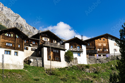 picturesque mountain village with white stone houses and stone roofs in the Swiss Alps