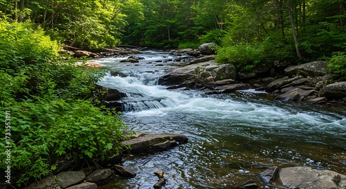 Picturesque river flowing through a lush forest with sunlight filtering through the trees