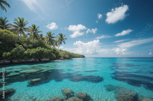 Picturesque tranquil tropical lagoon with palm trees lining shore crystal clear blue water and beautiful sky