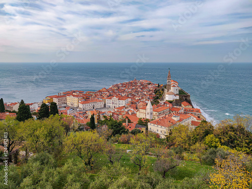 Picturesque view of the old town in Piran - a beautiful coastal town. Trees, Adriatic Sea and tiled rooftops. Slovenia