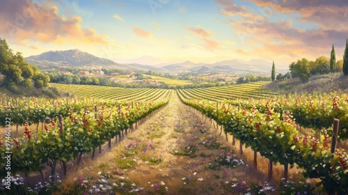 Picturesque Vineyard Landscape at Sunset with Rolling Hills
