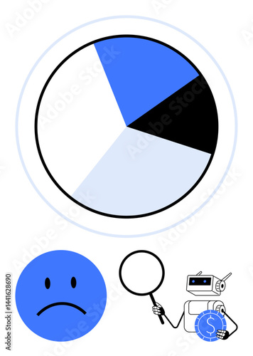 Pie chart analytics, magnifying data trends, robot with coin icon, and sad face showing loss. Ideal for financial analysis, problem-solving, technology, data management economy AI research. Flat
