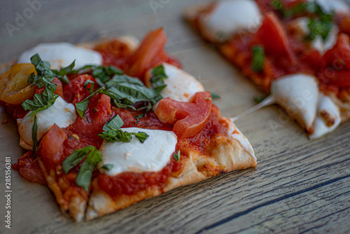Piece of Classic Margherita Flatbread Pizza on wooden board. Close up view.