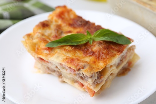 Piece of delicious cooked lasagna with basil on plate, closeup