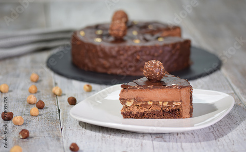 Piece of homemade delicious chocolate mousse cake on plate, on light background