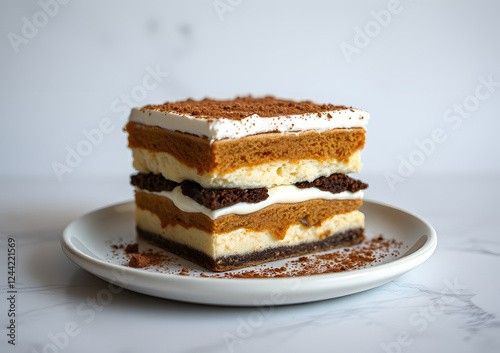 Piece of layered tiramisu cake on a plate, perfect for bakery, dessert, celebration, and food concept designs in need of visuals.