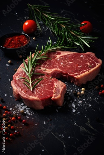 Piece of meat with a sprig of rosemary on top. The meat is surrounded by a variety of spices, including pepper and salt