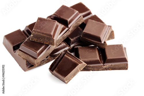 Pieces of bitter, dark chocolate bar, cubes on heap, isolated on white background, close-up view
