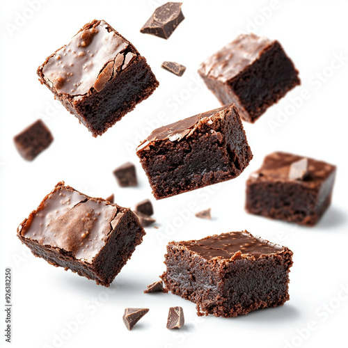 pieces of chocolate brownies floating or falling in mid air, isolated on transparent background, chocolate, cake, food, dessert, sweet