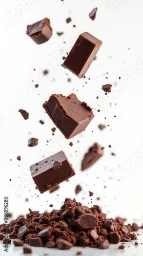 Pieces Of Dark Chocolate Falling Close Up On A White Background