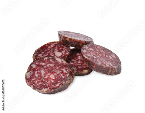 Pieces of delicious dry cured sausage isolated on white
