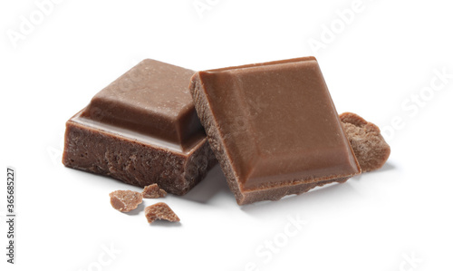 Pieces of delicious milk chocolate isolated on white