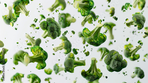 Pieces of fresh green broccoli are flying through the air. An explosion of broccoli on a white background. The concept of motion and energy. A healthier diet. A vegan diet