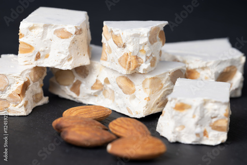Pieces of hard nougat, with almonds next to it, on a dark slate surface.
