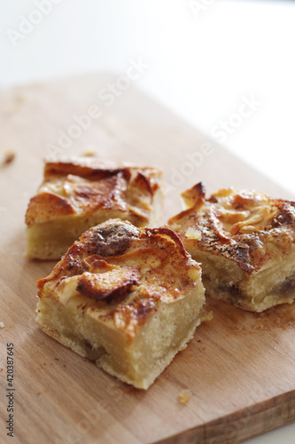 pieces of homemade apple pie with cinnamon on wooden board