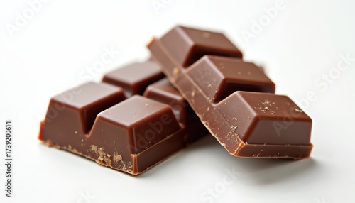 Pieces of milk chocolate bar on white surface. Chocolate broken into chunks. Brown sweet food isolated on white background. Delicious dessert and snack.
