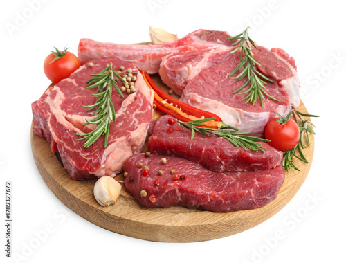 Pieces of raw beef meat, spices and tomatoes isolated on white