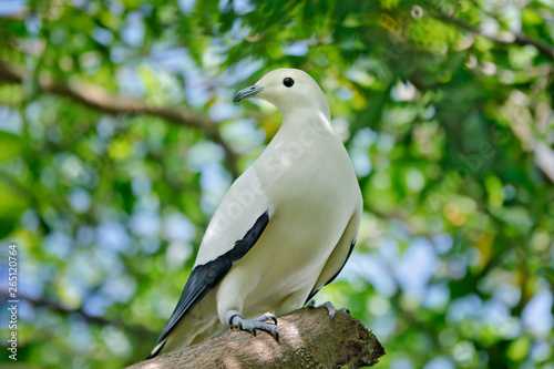 Pied imperial pigeon, Ducula bicolor, beautifull big white bird from Thailand. Pigeon in the habitat, sunny day in the green forest. Wildlife scene from nature. Bird sitting on the tree trunk.