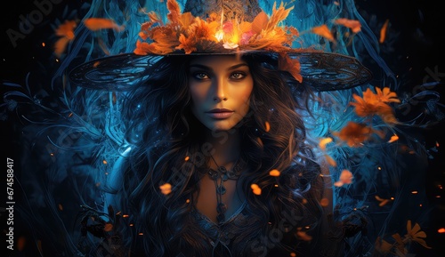Piękna czarownica w kapeluszu z kwiatami.