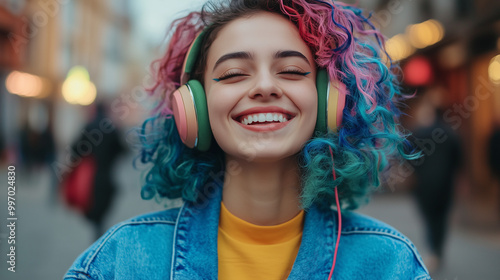 Piękna, młoda kobieta z kręconymi włosami w różnych kolorach słucha muzyki, uśmiechając się od ucha do ucha.