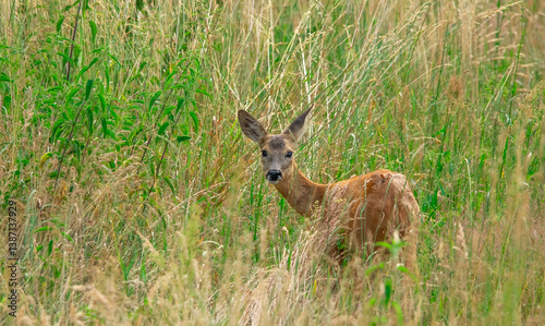 Piękna sarna stojąca w wysokiej trawie obserwuje otoczenie