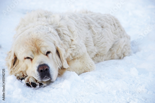 Pies rasy owczarek podhalański wylegujący się w zimę na śniegu w górach