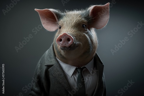 Pig in business suit. Photorealistic studio shot with grey background. Funny Wallpaper. Generative AI.